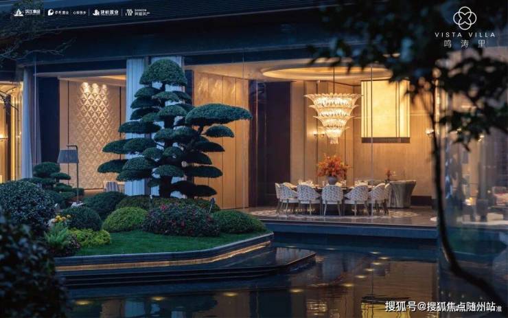 建筑立面上,鸣涛里一脉相承鸣湖里的设计风格,融合大面low-E玻璃、香槟金铝板、暖白色石材,勾勒灰色金属铝线条,搭配标志性的“飘檐云顶”,并转译“飞檐翘角”、“撺檐杆”、“版引檐”、“寻杖绞角造”等元素,既有宋式建筑的经典韵味又不失现代风格的灵动飘逸。