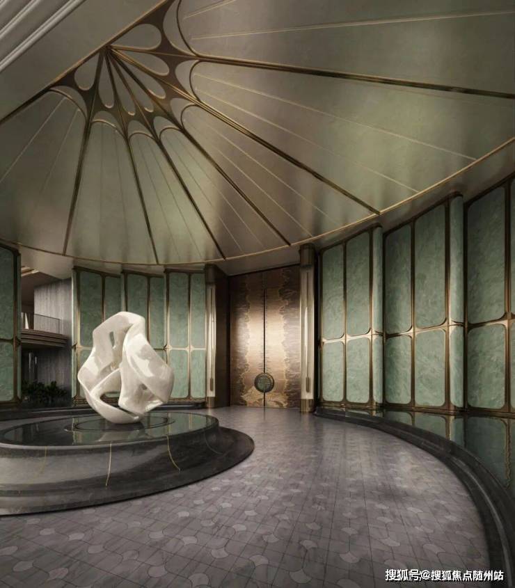 比如约56x11.5米的超尺度门庭,顶部以杭州折扇为造型灵感,寓意“藏风聚气”;四周还有12片巴西进口的百达翡绿奢石雕琢的玉石屏风;中间还有约9.6x5.3米的巨幅铜门,是由非遗传承人朱炳仁手工锻打,再现钱塘潮涌的磅礴气场。