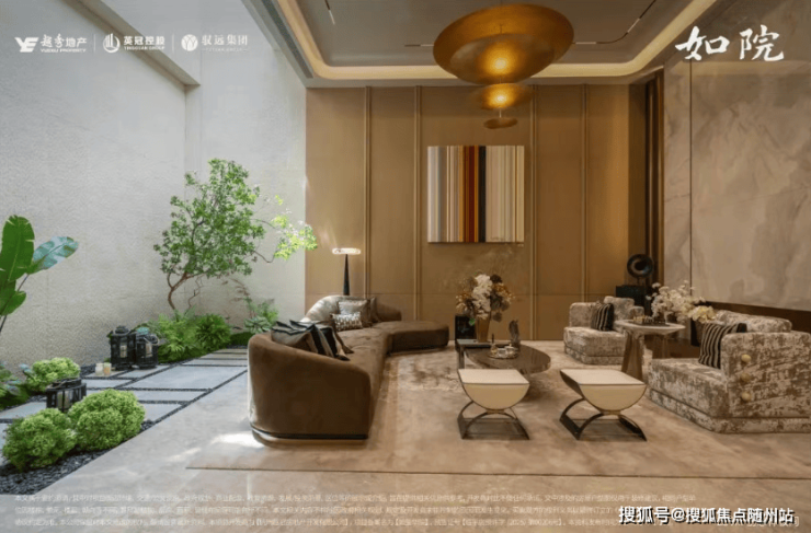 约43米恢宏门庭两侧黑松耸立,挑高约13米的归家大堂彰显尊崇礼序。中庭处约15米叠石飞瀑倾泻而下,与约1300㎡下沉式庭院共同构成三层立体观景式山水画境。