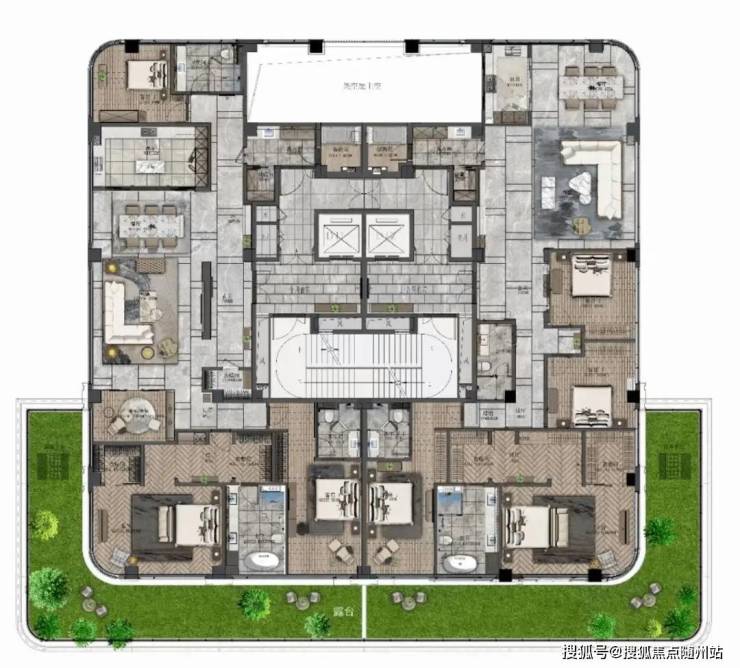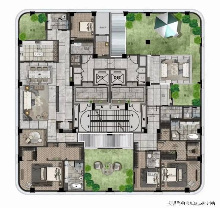 顶楼490㎡户型“一层一户”,赠送3个露台,媲美别墅空间体验。
