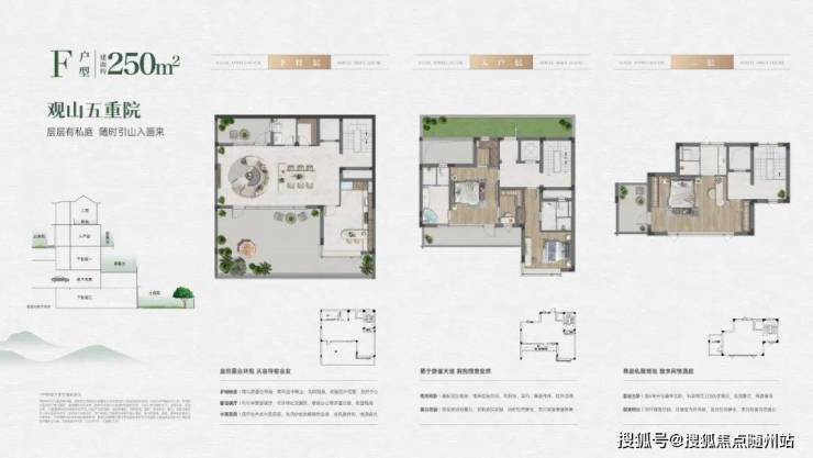 以主力建面约250㎡合院户型为例,整体空间着重刻画了3个不同层次的庭院,上可观星赏月、下可莳花弄草。