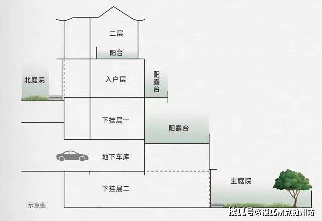 入口处小而精致的入户北庭院,形成内敛的氛围,与室内空间联通;开放式私家主庭院,结合下挂层&入户层延伸出的阳露台空间,形成多角度、全方位观景视野,使居者于日常之中,体验 “目之所及皆宾客,松间月,林下风”的独有东方禅境。