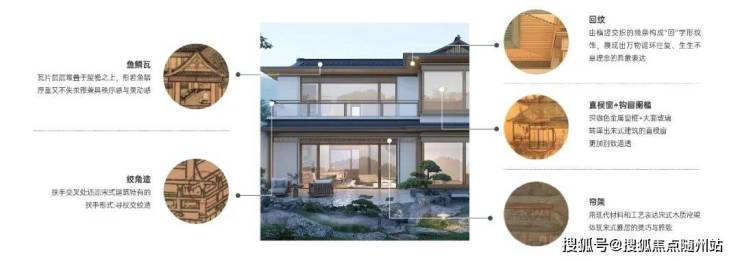 为寻求更为写意的效果,设计团队精心择取鱼鳞瓦、纹角造、通透的直棱窗和钩窗阑槛、回纹、帘架等宋风元素,筑造出完美融合传统与现代的宋式雅居。
