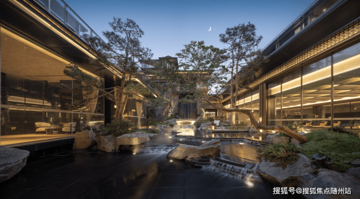 漫步于光影交织的幽静庭院,您将踏入一方充满诗意的天地。潺潺流水映照着婆娑树影,挺拔树姿为这片空间注入向上的生机,纵向延伸出无限的视觉张力。这座下沉庭院,不仅拉近了建筑与自然的情感共鸣,更使室内与景观紧密相连、和谐相融。每一扇窗户,都犹如框中的一幅生动山水画。