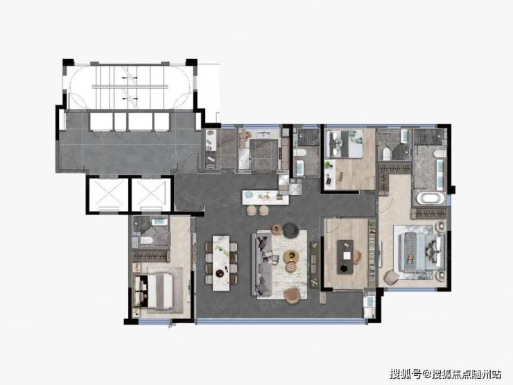 建筑面积约183㎡『臻萃』海派样板间同样出自叶飞之手。整个空间主色调采用深色系+浅色系组合强化层次感,天花板、墙面、收纳柜等处大量运用弧线设计,又以瓷盘式悬浮吊顶等具有中式韵味的元素加以点缀,诠释海纳百川、中西交融的海派审美。