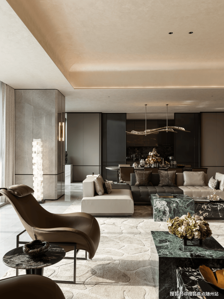低矮而松弛的沙发围合出交流场域,绿纹石茶几与米色地毯在质感上形成互补,温润与克制并存。