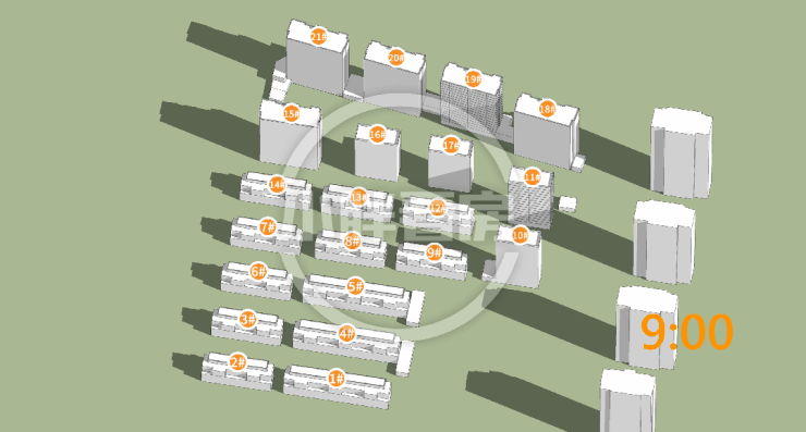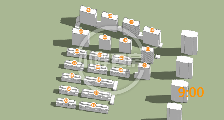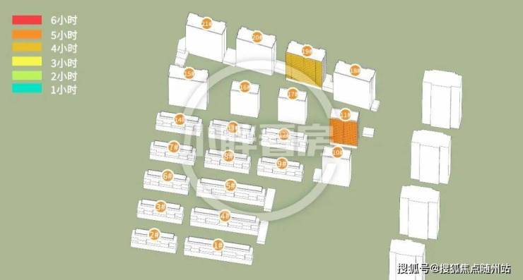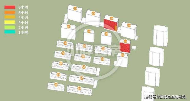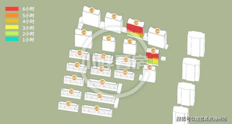 夏季:由于楼栋建筑朝向为西南偏转和夏季太阳角度原因,楼栋在上午处于阴影中,日照时长有相应折损。