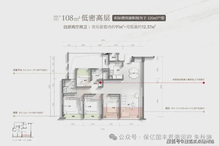 创新采用开敞式电梯厅设计,将公摊系数压至20%以内,套内得房率提升5%。建面约108㎡中间套通过空间优化实现四房布局。户型设计可变空间,如只需3房,也可打造大开间阔绰客厅空间。