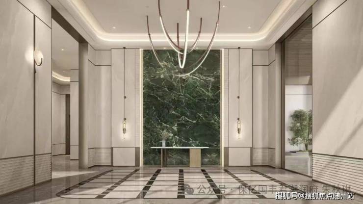 首层约4米超高大堂以米色岩板墙面搭配浅灰色瓷砖地面,普拉达绿奢石背景墙,不锈钢收边工艺彰显精致感,构建归家仪式链。