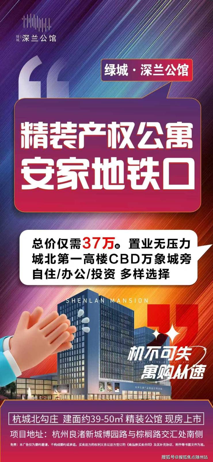 📍📍绿城深兰公馆-约39-50㎡精装百变公馆,一间小公寓,N 种人生打开方式,自住|出租|办公|创业,总价37万起 小空间 大作为,城北 CBD・万象城旁