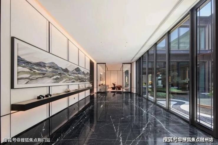 从当代艺术馆到板块唯一的国标恒温泳池、健身房、瑜伽室,溪映听庐的听庐雅舍使用了大量的玉石和金属,雅奢的质感拉满。
