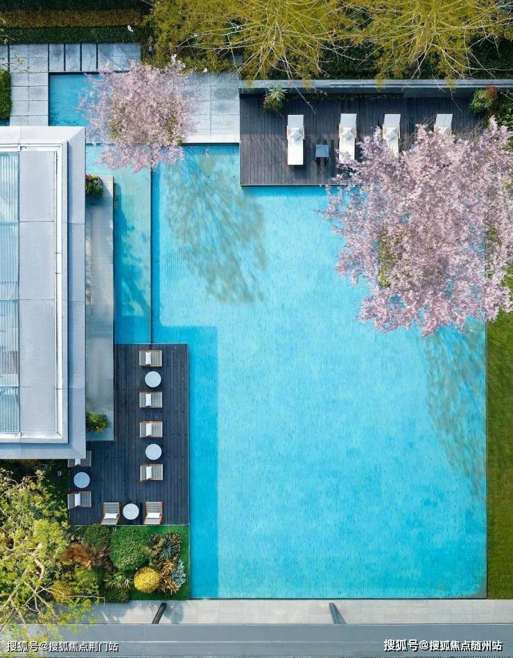 活力剧场里设计了湛蓝的景观戏水池,水岸布置茶几休闲躺椅、还种上了一大一小两株樱花树,度假感直接拉满。