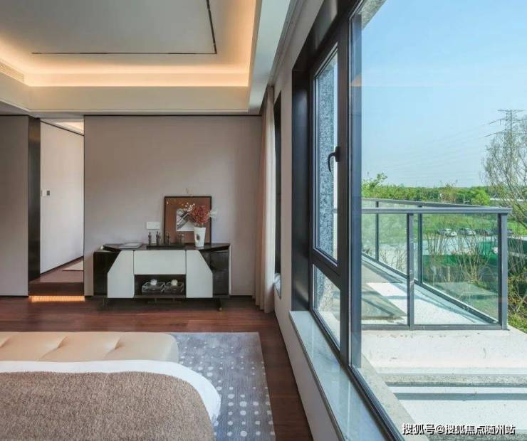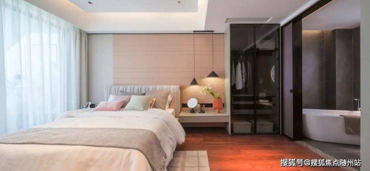 主卧套房设计,南向揽景飘窗拥有更多可拓空间,不仅延伸了主人的寝居尺度,更赋予丰富的场景体验感:枕山看湖听雨,在夏日午后补一觉好眠,好不惬意。