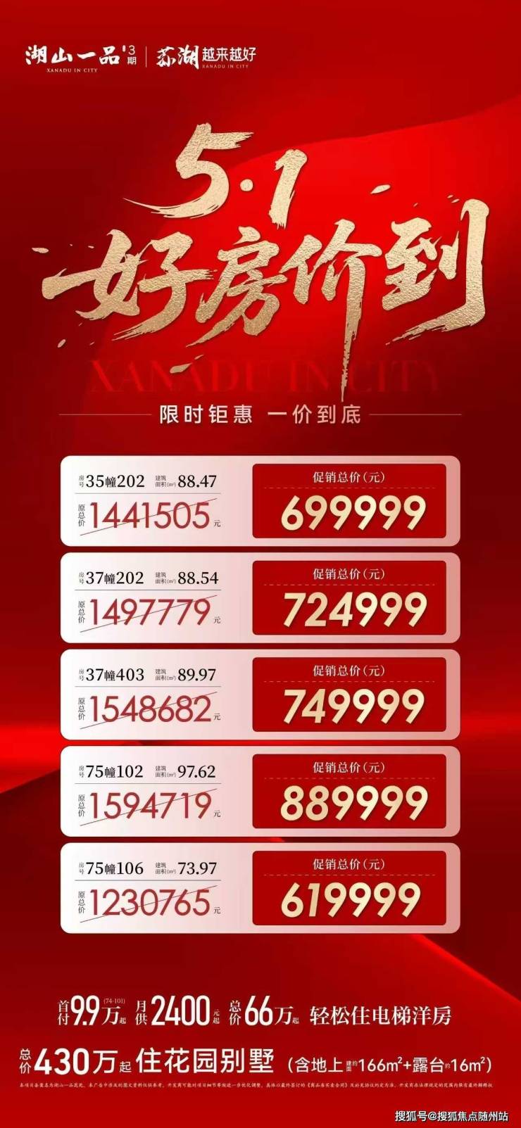 洋房:均价约10800元/㎡,为周边同类型产品6.5折,75㎡小户型总价75万起。