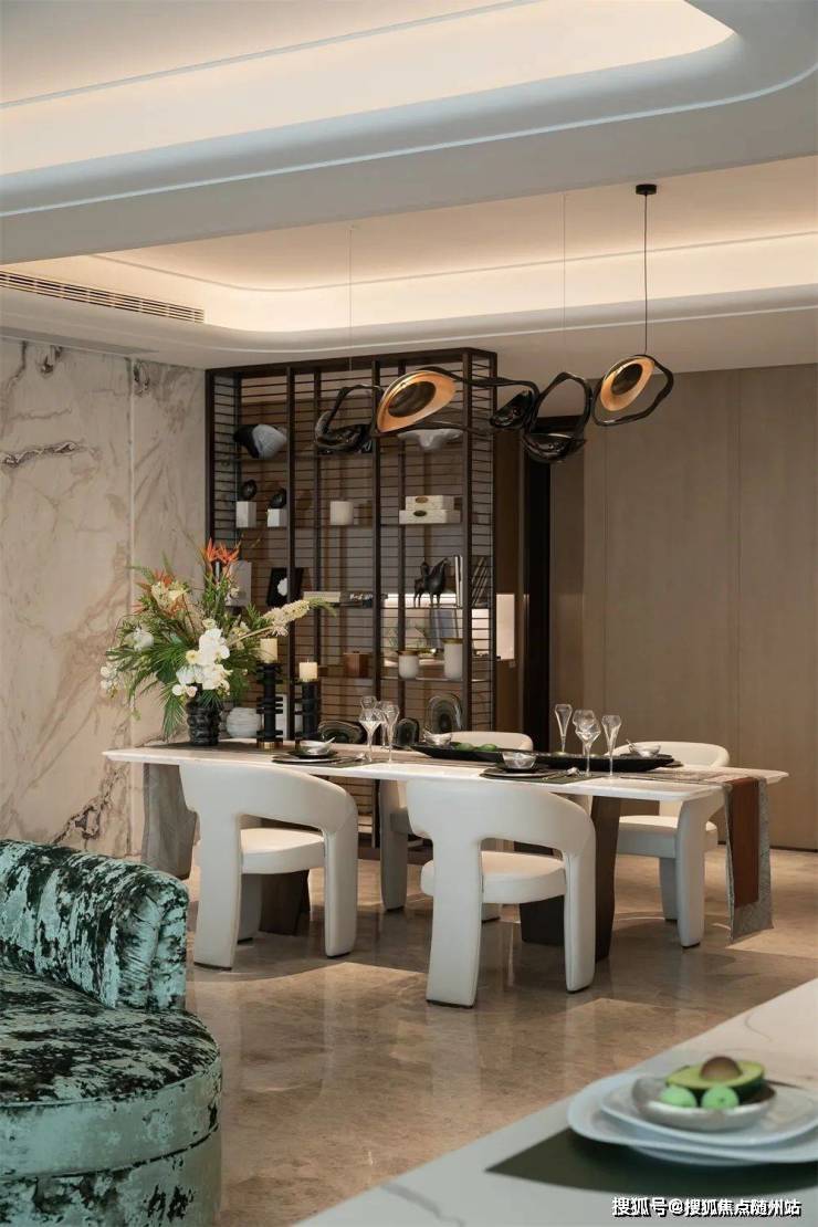 建面约325㎡孟也作品,则以线条柔化空间边界,新艺术护墙板与石材组合演绎材质美学。