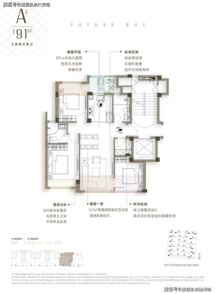 建面约91㎡真三房真南北通透(北侧无消防连廊),最小卧室近9㎡,各卧室面宽≥3米;三卧均预留衣柜区,全能收纳王;
