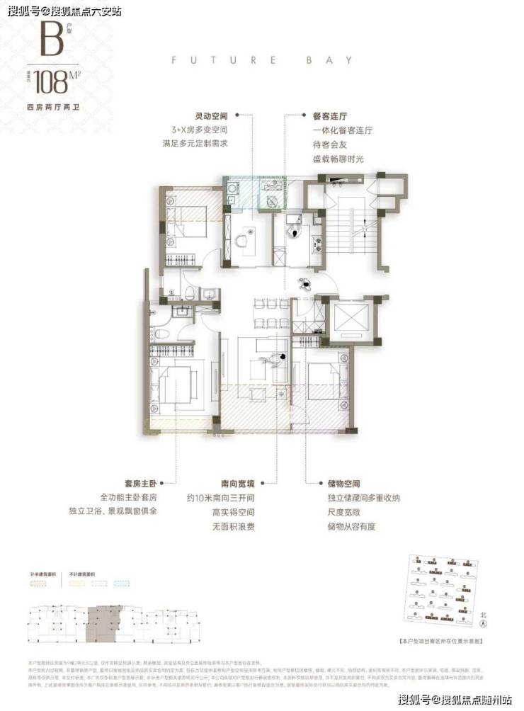 建面约108㎡:布局同91㎡,北向多1房间,适配二孩家庭;