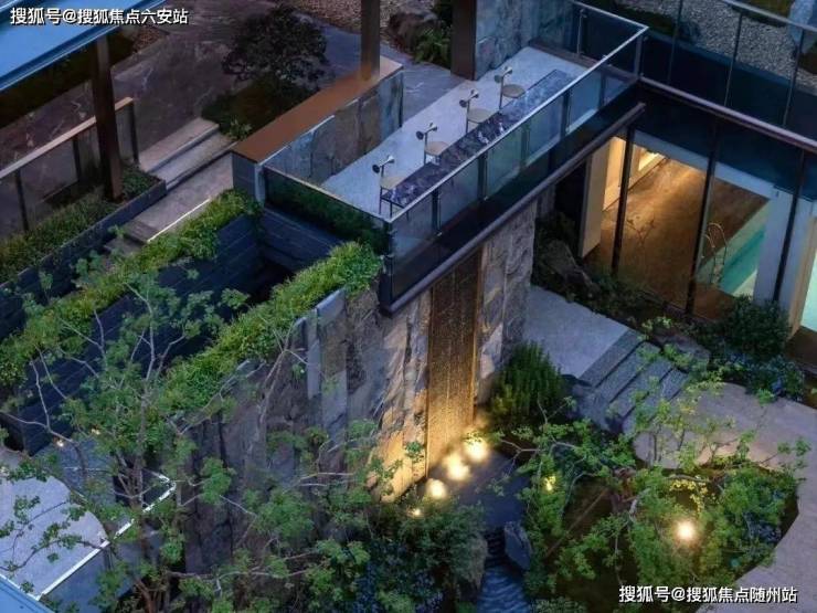 昂贵的黑松和羽毛枫分立两侧,四角是设计师精挑细选的乌桕树,中间叠水曲折辗转,宛若自然秘境。
