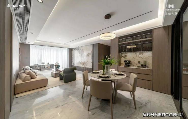 餐客厅一体化设计,顶部做了悬浮顶+无主灯设计,再加上客厅全木纹饰面,大气而又温馨。