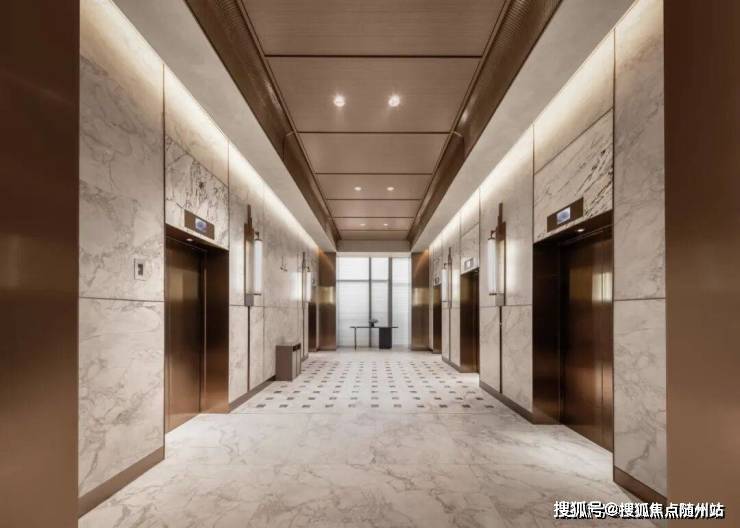 电梯厅,奢感随处可见。地面嵌入玻利维亚蓝奢石、电梯门运用比肩五星级酒店的哑光铜表面拉丝工艺,彰显雅奢特性;电梯内部则以技艺更为复杂的木饰面弧形转角、黄金比例分割的金属哑光拉丝腰线,呼应高级定制的品位。