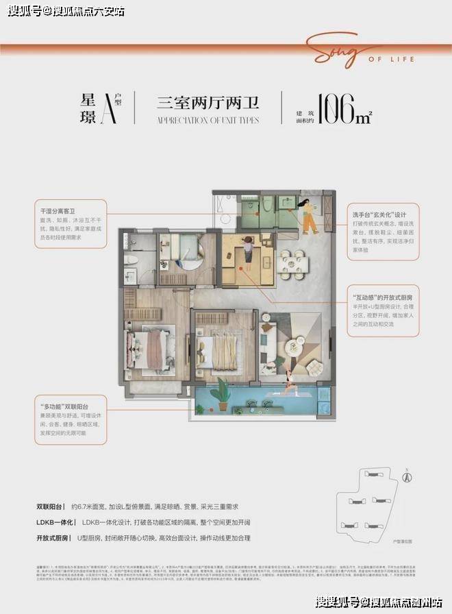 约106㎡户型点评:双联阳台约6.7米面宽,加设L型俯景面,满足晾晒、赏景、采光三重需求,LDKB一体化设计,打破各功能区域的隔离,整个空间更加开阔,开放式厨房 U型厨房,封闭敞开随心切换,高效台面设计,操作动线更加合理!