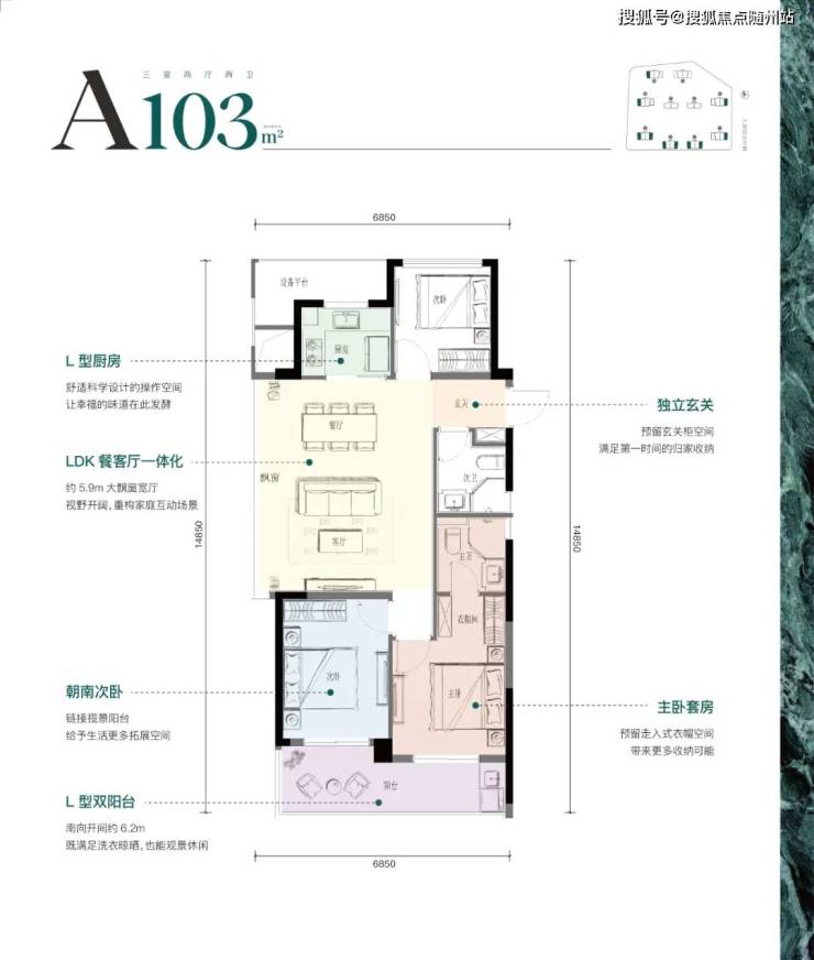 建面约103m²:在其他楼盘一般是中间套,但在月琉璃是带约5.9米大边厅的“派对级边套”。朝南双联L型大阳台,拓宽视野与居住实用性,采光优秀。带步入式衣帽间+独立卫浴的套房主卧等等,都将改善品级呈现得淋漓尽致。
