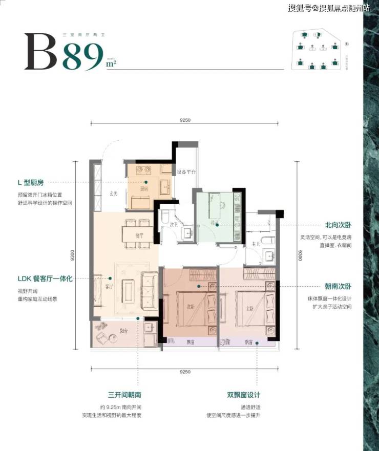 建面约120㎡的四房边套户型,不仅有6米带飘窗的边厅,三个卧室朝南,南向面宽达到了约9米,主卧套房设计,保证居住私密性与舒适度;