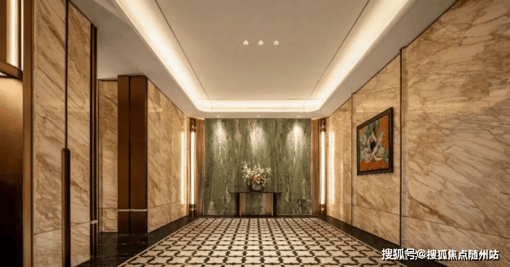 比如各种各样的石材,在锦上观澜的入户大堂、单元大堂的墙面和地面,你是看不到砖的,基本都是奢石,各种石材、各种拼花。哪怕是到了139方类一梯一户,每家门口的独立电梯厅里,一样用的是石材。