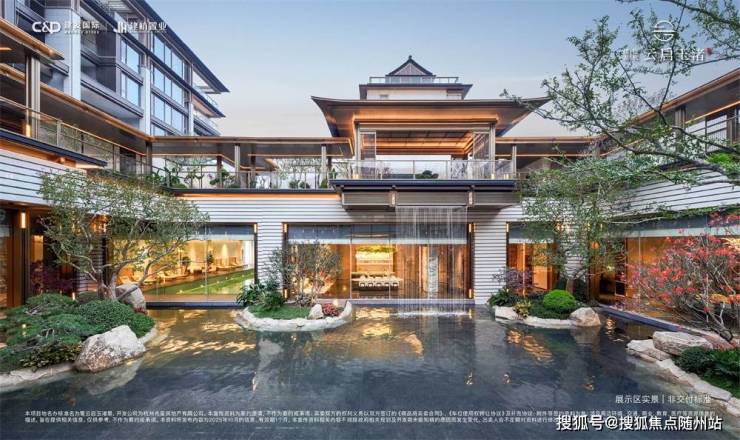 屋檐取形北京太和殿庑殿顶,融入良渚高台夯土文化,搭配铜狮、涌泉、五步青云阶,辅以琮黄色调装饰,营造归家非凡礼遇。