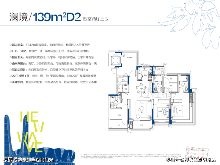 约171㎡大四房:三卫双套房,南向面宽约15.5米,主卧带L型转角飘窗,总价约700万实现终极改善。