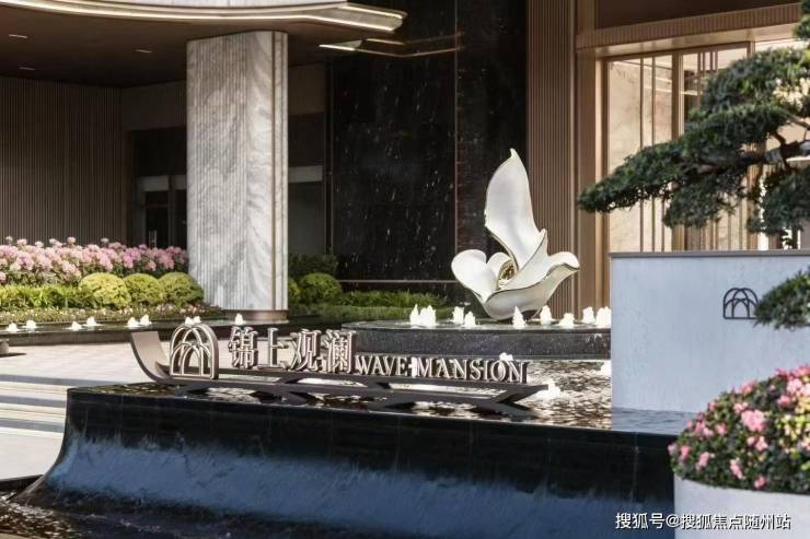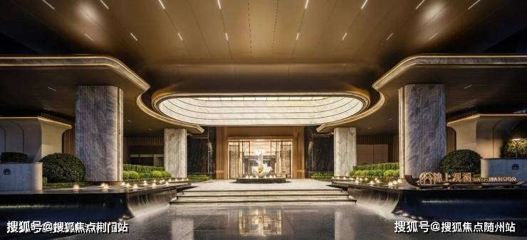 如果近距离看,项目的入口细节之处又不是奢华,尤其是大面积的奢石运用(梵高白奢石+古驰黑石材),绝对是大手笔,再搭配四根梵高白立柱托起古铜色铝板,层层抬升,豪宅大院的气质扑面而来。