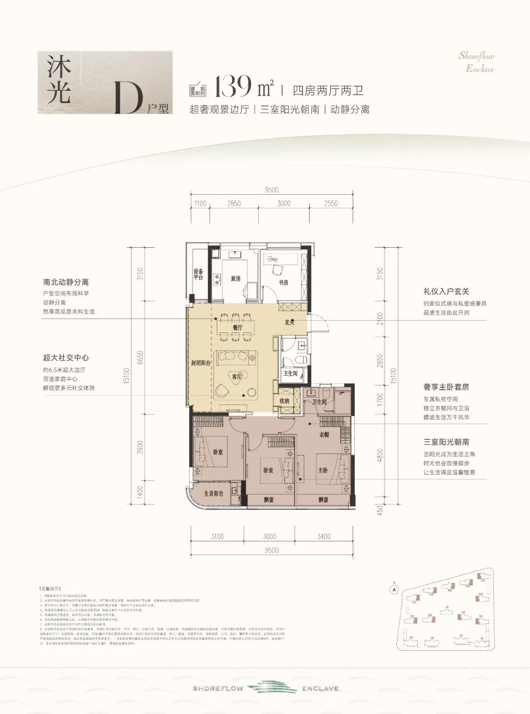 建筑面积约139m²D户型,同样也是四房两厅格局,相比124户型,每套都远离项目南侧主干道,私密性和环境更优,是高净值注重隐私客群的不错选择。南向3面宽,三房朝南阳光充足,家庭成员都有着独立的生活空间。连着约6.5米封闭阳台,可打造多个生活场景。