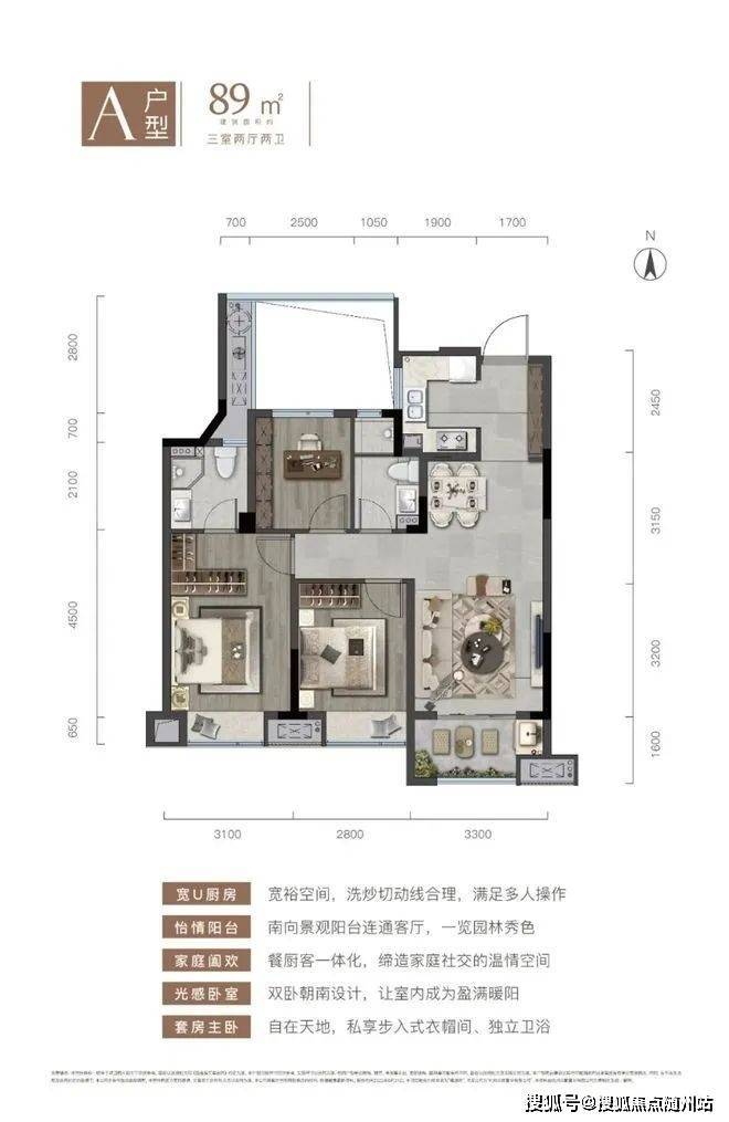 建面约89m²全能大三房,主次卧空间充沛,主卧套房式设计、三开间朝南向、双卫设计,空间多得;建筑面积约105㎡大三房全明户型,双卧朝南、拥约7米南向景观阳台、餐客一体横向约6米宽幅采光。更高的得房率,安放生活多重逸趣。