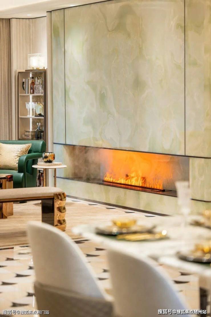 均价3000万的揽奥800同款的风格,电视背景墙采用揽奥800方同款的青玉,地面是四种奢石水刀拼花。