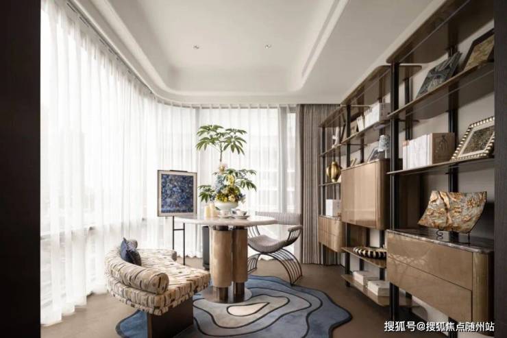 在约268㎡户型中,约3.15米层高搭配全景玻璃幕墙,把钱塘江景和社区五重园林“框”进家里,即使在客厅角落,也能看到江风拂过树梢。