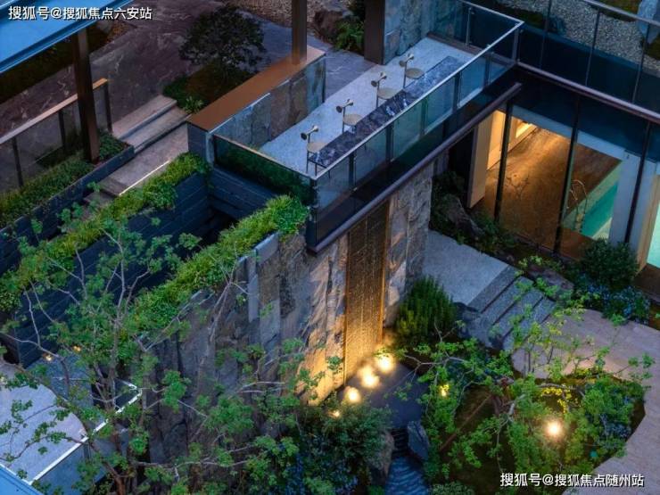 昂贵的黑松和羽毛枫分立两侧,四角是设计师精挑细选的乌桕树,中间叠水曲折辗转,宛若自然秘境。