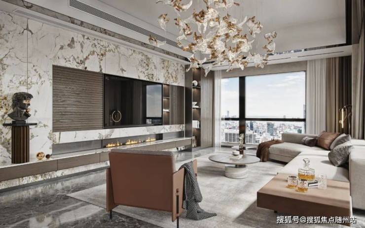 全屋通铺天然石材+威斯岩板背景墙,配置汉斯格雅卫浴、杜拉维特五金、西门子智能厨电。搭载华为全屋智能系统,一键控制灯光、窗帘、空调,新风+中央空调+净水三重净化,PM2.5过滤效率达95%。