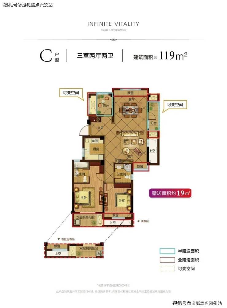 【119方】当然,也有供刚需购房者“一步到位”的三房户型——119㎡,其中可变空间也有约19㎡。