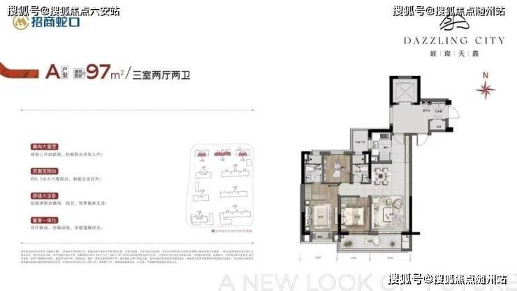 建面约97㎡三房两厅两卫,三开间朝南、动静分离、用纯粹的生活体验感,直击刚需群体想要拥有品质生活的内心。