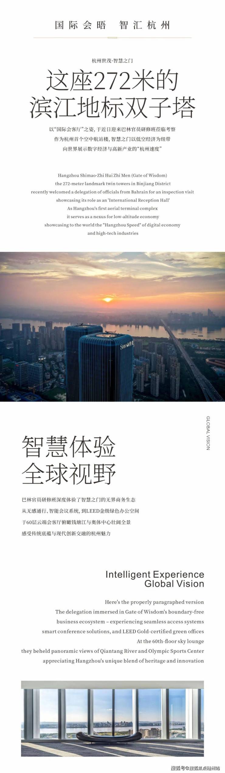 世茂智慧之门由世茂集团匠心打造,深耕高端商务领域35年,以深圳世茂深港国际中心、上海世茂大厦等全球地标奠定运营实力。项目团队以“地标+产业+资本”三维模型,重新定义钱塘南岸商务新标准。