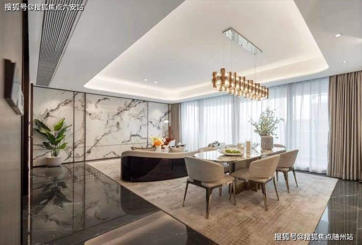 金色铝板挑檐、四面全干挂铝板+三玻两腔玻璃幕墙,搭配仿金丝楠木线条,打造现代与古典交融的“宋风立面”;主入口采用“普拉达绿”奢石与百年罗汉松造景,彰显归家仪式感。
