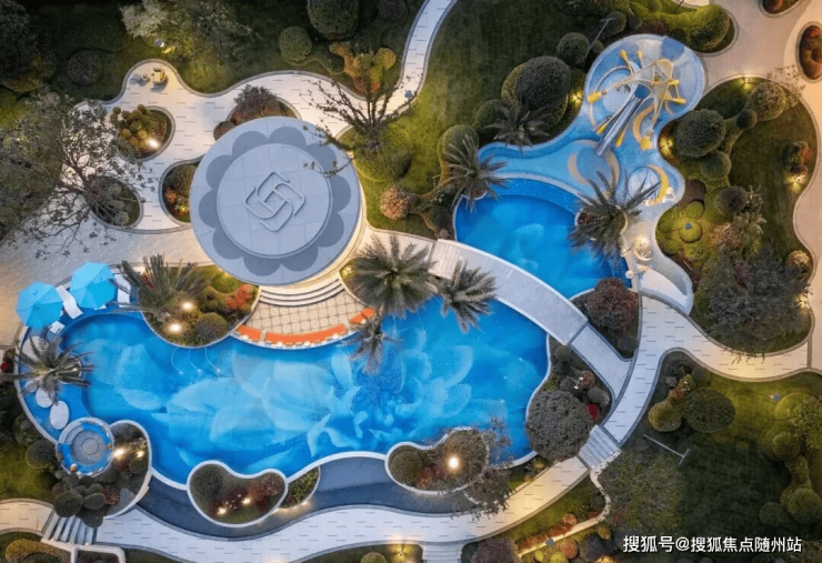 下沉式庭院和小区最大约8米的高差,则形成立体园林景观,既有悬挑平台又有空中花园以及瀑布跌水。此外,中央水景则是滨江特有的地中海度假风格水池,特别在于设置前滩儿童戏水区,营造亲子互动场景。