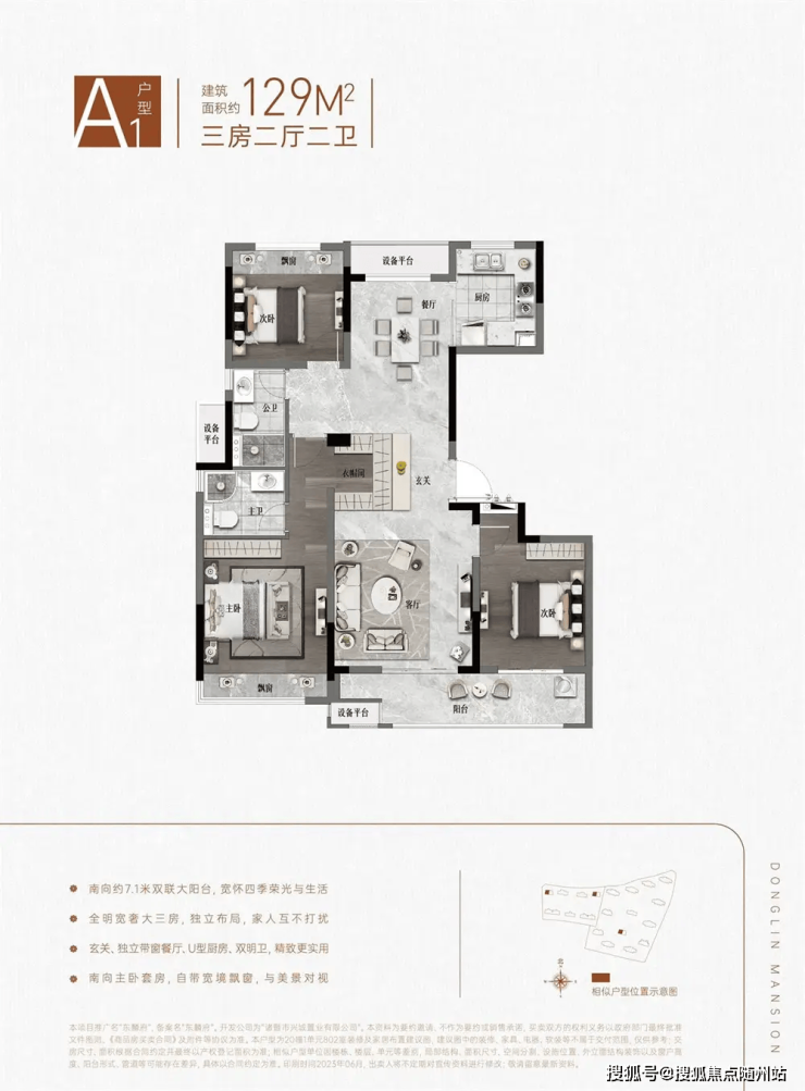 建面约129㎡三房户型:分布于4号楼、17号楼、20号楼,三开间朝南,动静分区,适合三口之家或新婚夫妇;