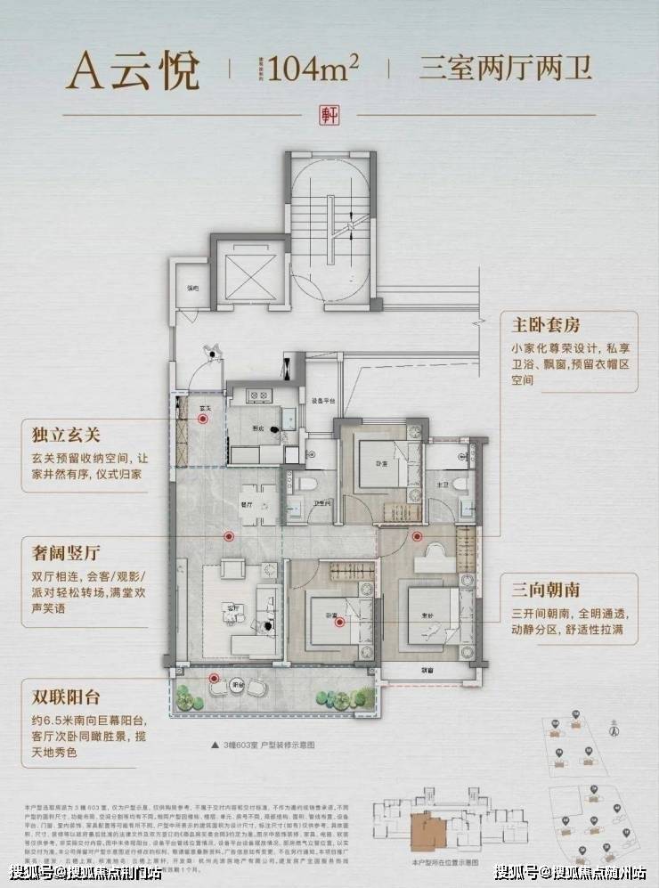 起步约104㎡,不仅做到了约6.5米双联阳台和主卧套房,还预留一整面墙的玄关收纳柜空间,主妇见了会欢呼。
