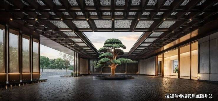 宽阔的门头有古松相迎,含蓄的格栅与天井透露出隐奢意境。