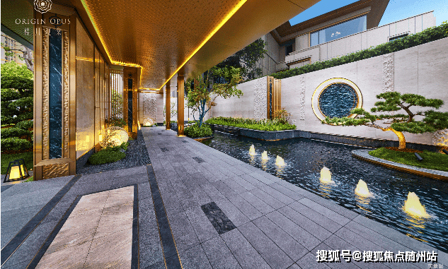 入户两侧水景清泉涌动,婉转迂回,一座精致的宋风美学馆展示在眼前。透过门框衬映出满月景墙,甄选名贵奢石,在虚实掩映间延续着东方诗意山水的写意画卷。