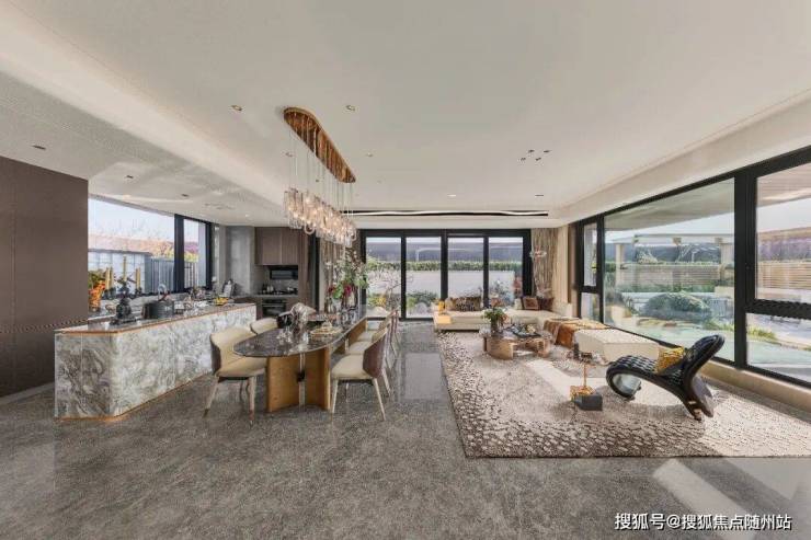 一层:南向开间约10.5米,餐客厅近50㎡(石材地面),U型厨房配老板四件套,LDK一体化设计视野开阔;南向3.6米客房+卫生间,可改套房。