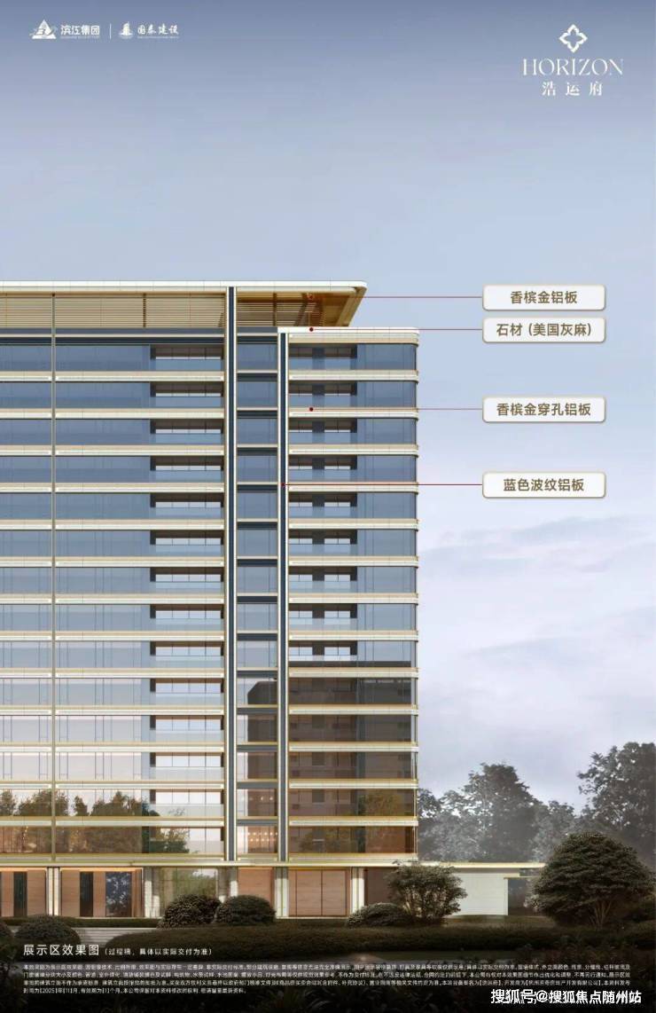 立面以金属铝板勾线,描摹世家风骨,搭配大面积玻璃幕墙,渲染出“浩运金”与“钱塘蓝”两大主色调。