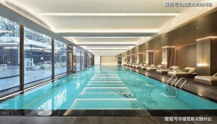 夜幕降临时,镶嵌在下沉式庭院里的室内恒温泳池,像是一个巨大的玉匣,同样散发着迷人的光芒。当你畅游在这秋水澄流中,你又变成了「琳琅珠玉」的写照。