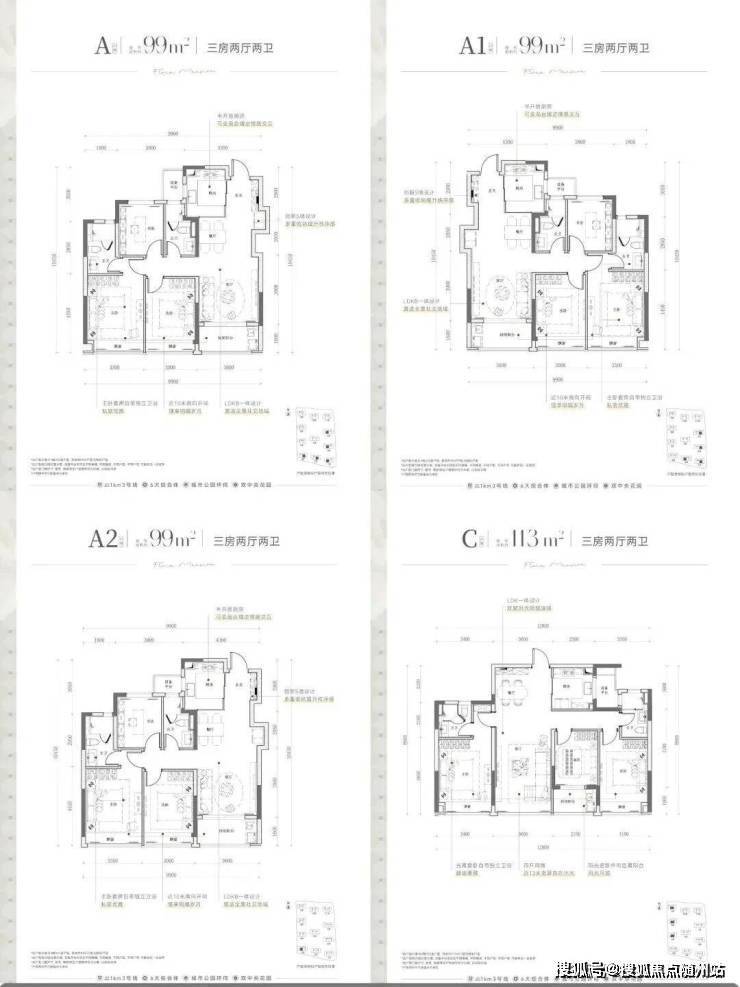 户型设计:建面约99㎡的三房两卫户型,动静分区,采用三开间朝南设计。建面约113㎡的三房两厅两卫户型,四开间朝南,拥有封闭式阳台,南向采光充足,使得整体空间更加宽敞明亮。
